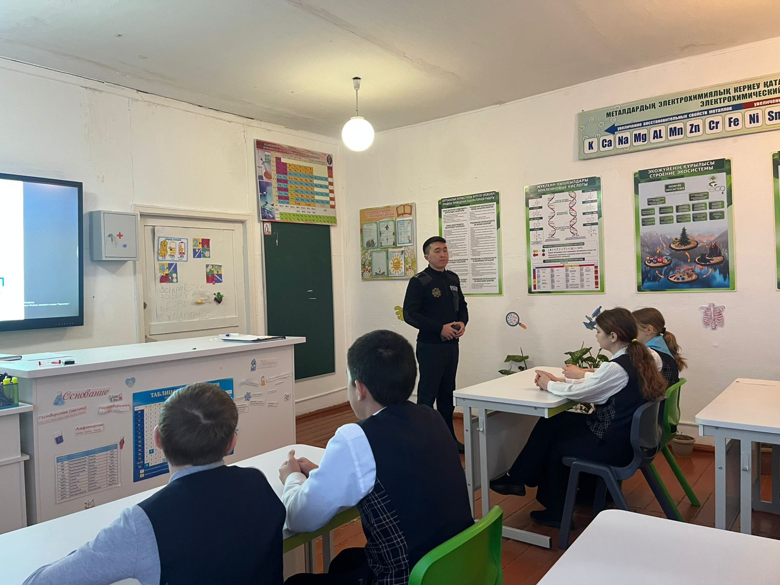 В рамках месячника «Закон и порядок» в нашей школе состоялась встреча учащихся с УИП старшим лейтенантом Кайсаевым Бекзатом Аяновичем.